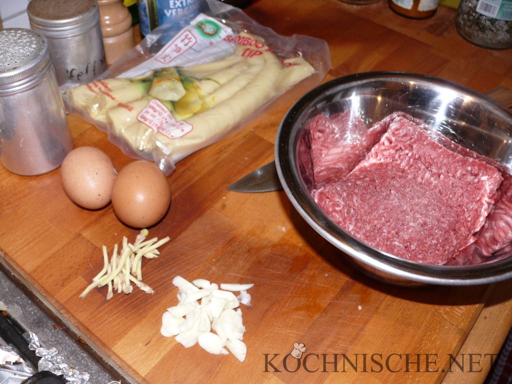 Die letzten 3 Tage hatten wir jedenfalls einen total netten Studenten aus China zu Gast – den ich natürlich überzeugt habe, mir ein leckeres traditionelles, klassisches Essen zu kochen. Bzw. beizubringen. Seine Wahl fiel auf Bambus mit Schweinefleisch. Da ich ja nicht besonders gerne Schwein esse, haben wir es mit seinem Segen kurzerhand durch Rindfleisch ersetzt. Wir waren uns einig, daß das Ergebnis sich durchaus sehen lassen konnte und eine Veröffentlichung sicher wert ist. Viel Spaß beim Nachkochen – und essen!