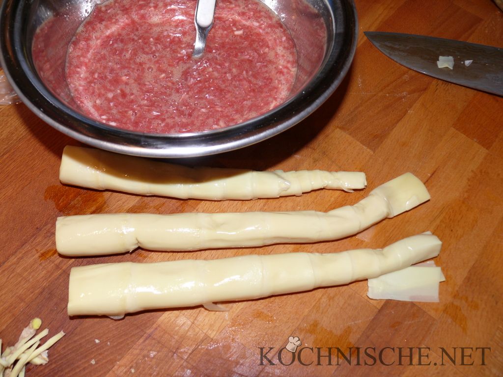 Knoblauch und Ingwer schälen und in Stifte schneiden. Den Bambus in ca. 5 cm lange Stücke und dann in Scheiben schneiden. Gründlich unter kaltem Wasser waschen.