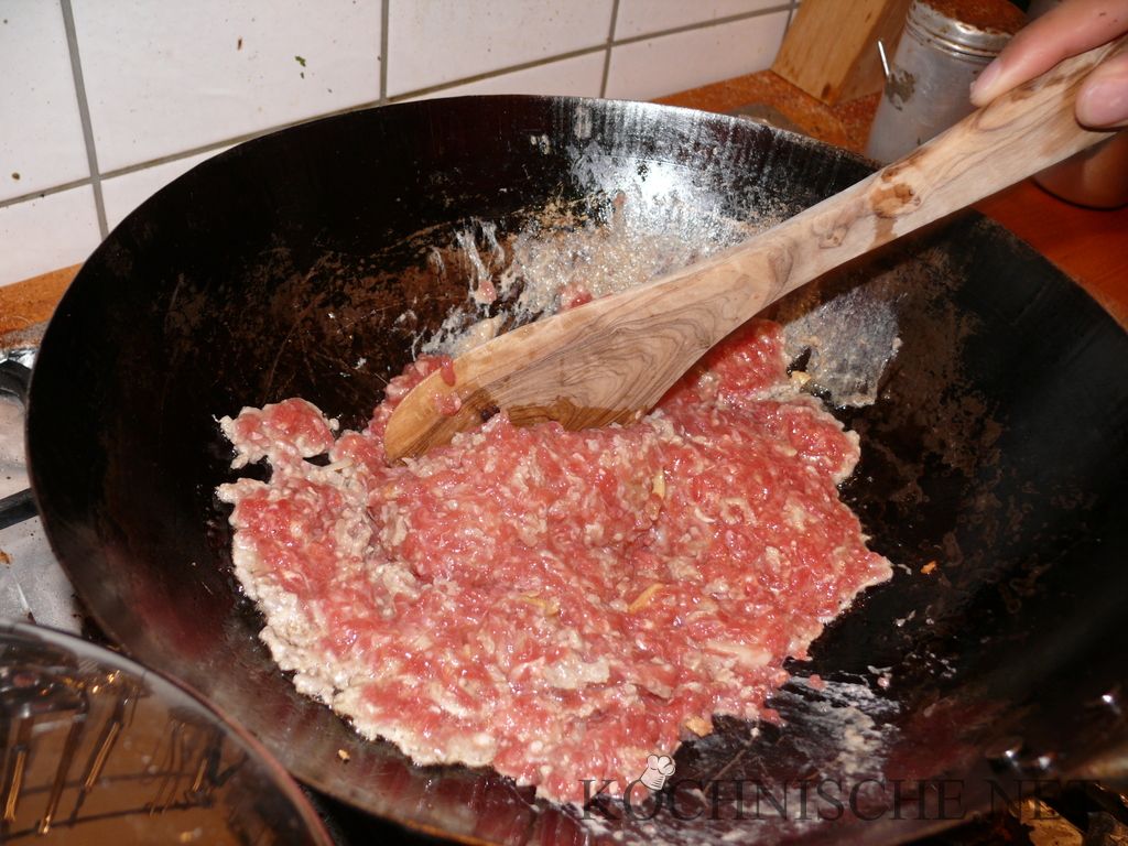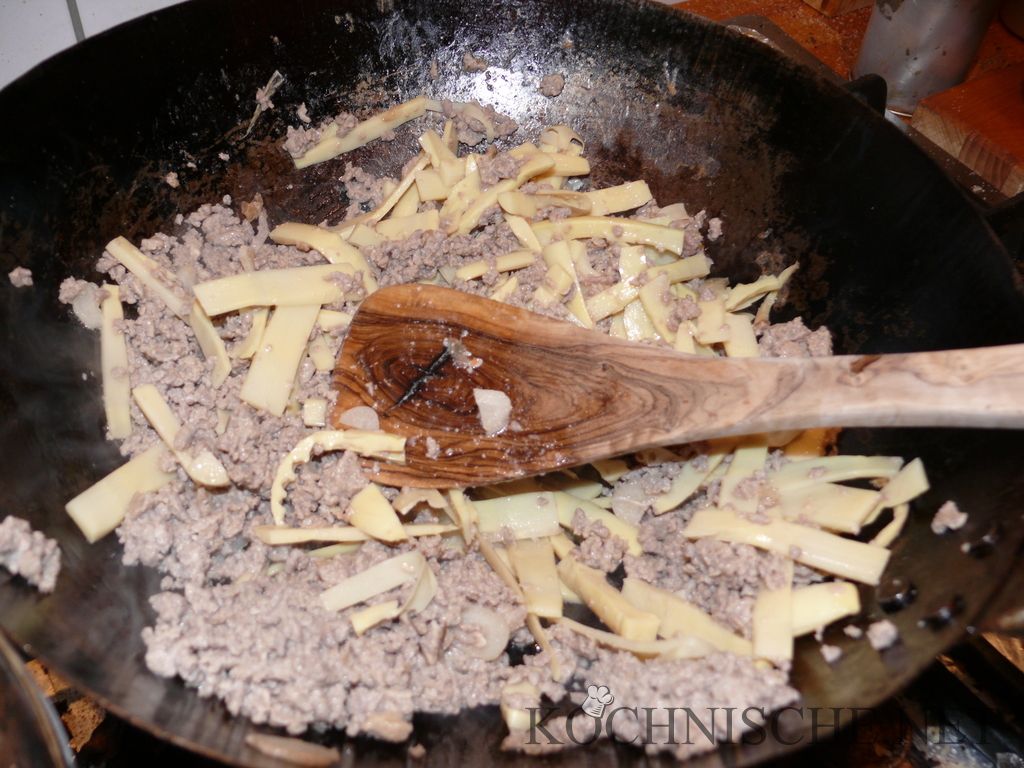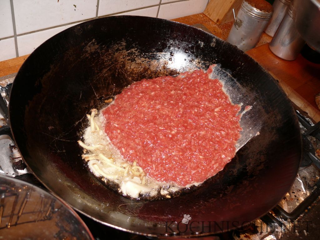Erdnussöl in einem Wok erhitzen. Den Knoblauch und den Ingwer darin anbraten. Dann das Fleisch-Ei-Gemisch zugeben und unter Rühren garen. Nicht bräunen.