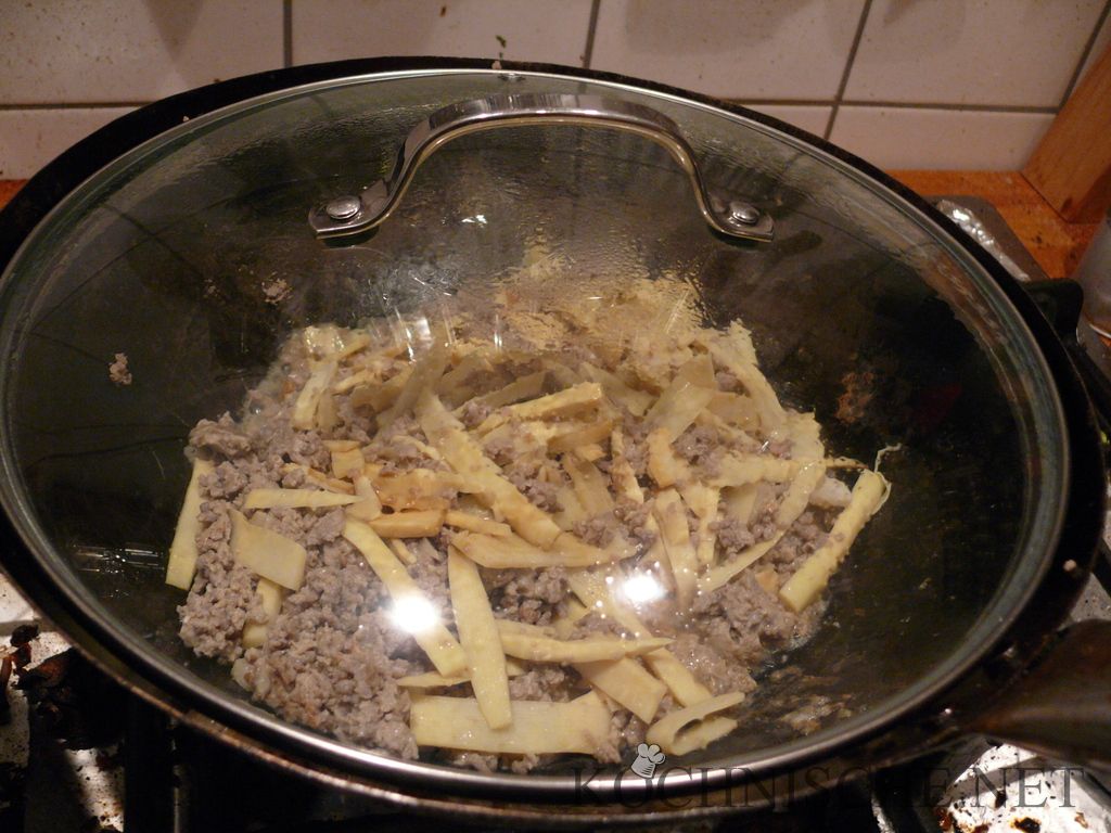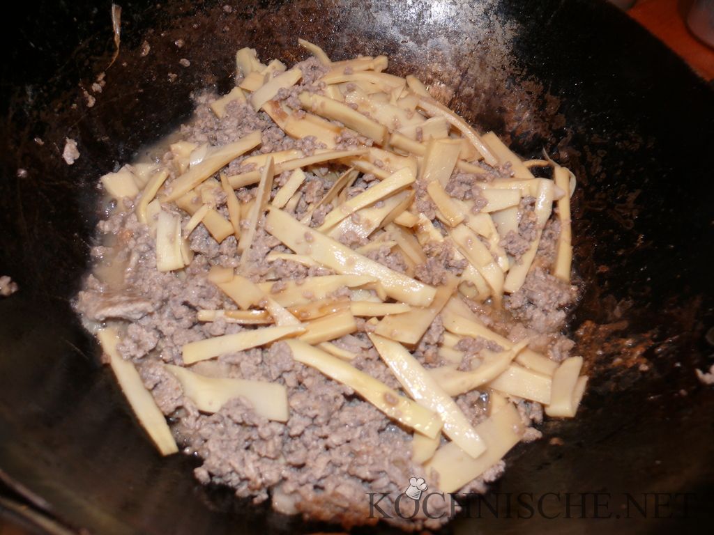 Wenn das Fleisch fast gar ist, die Hitze reduzieren und den Bambus hinzugeben. Alles für rund 2 Minuten unter stetigem Rühren braten. Die Sojasauce hinzugeben und den Wok mit einem Deckel abdecken. Für weitere 3 Minuten köcheln lassen.