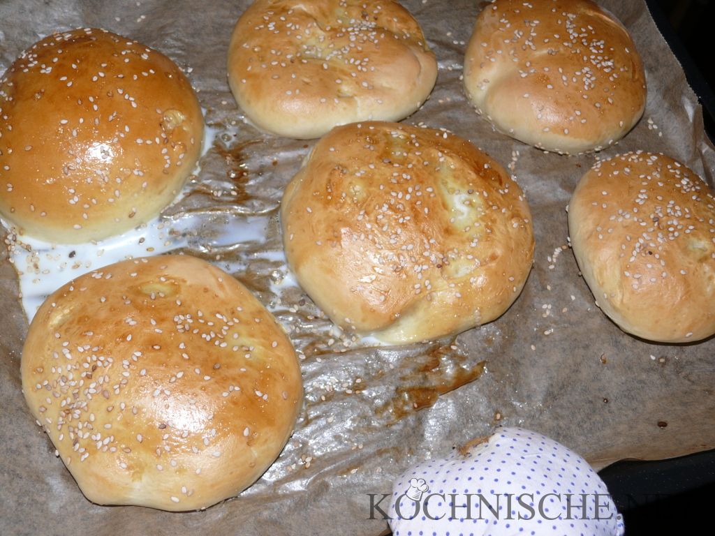 Im auf 180°C vorgeheizten Backofen ca. 15 Minuten backen, bis sie die gewünschte Farbe haben. Vom Blech lösen, etwas abkühlen lassen und aufschneiden. Dann in eine lebensmittelechte Plastiktüte (Gefrierbeutel o.Ä.) geben und verschließen. Mindestens 10 Minuten abkühlen lassen. Auf diese Weise erhalten die Brötchen eine angenehme weiche Konsistenz.