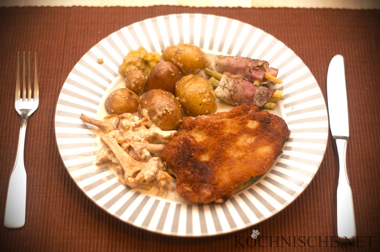 Und hier der zweite Gang des Saison-End-Menüs. Sowohl die Pfifferling- als auch die Bohnenzeit neigen sich dem Ende zu – gleichzeitig gibt es bereits frische Baby-Kartoffeln. Eine wirklich sehr gelungene Kombination aus drei feinen Beilagen und einer leider viel zu oft falsch verstandenen Art, Kalbsschnitzel zuzubereiten. Lecker!