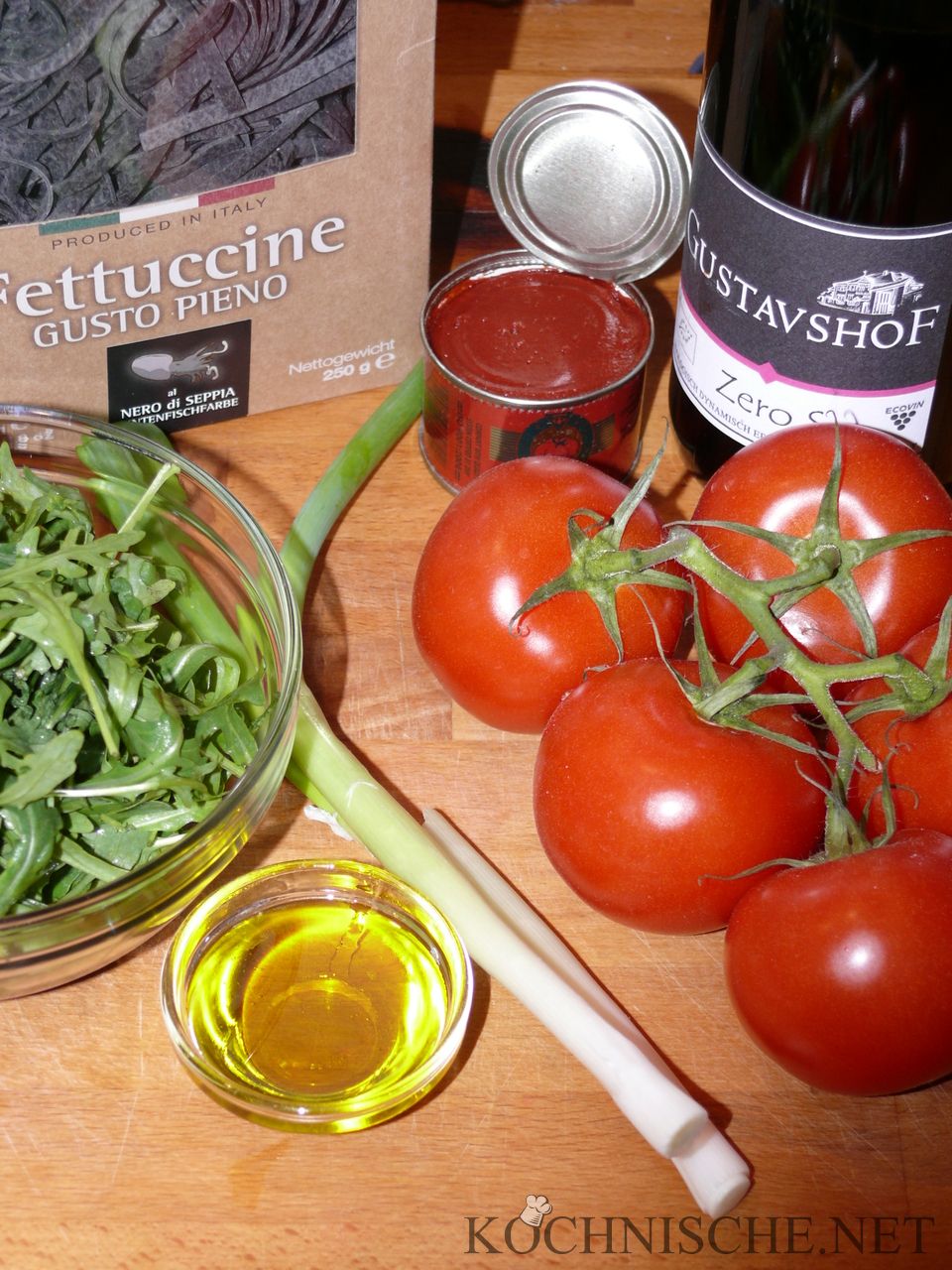 Zutaten für Fettuccine al nero di seppia con pomodoro e rucola