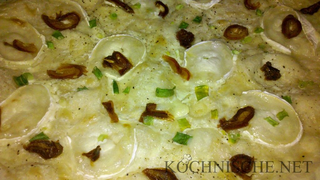 Bei mir “op’dr Eck” hat vor einiger Zeit ein neuer Bäcker auf gemacht, der auch Mittagstisch anbietet. Da ich kürzlich gerade zur Mittagszeit und mit knurrendem Magen dort lang ging, dachte ich mir, ich könnte doch mal probeessen. Die Speisekarte war nicht allzu umfangreich und sehr Schweinefleisch-lastig, also habe ich mich für den Flammkuchen mit Ziegenkäse, Datteln und Feigensenf entschieden – seine gute Wahl! Als wenig später ein großes Pizzaessen bei Muttern stattfinden sollte, habe ich das gleich mal nach gekochtbacken. Lecker!