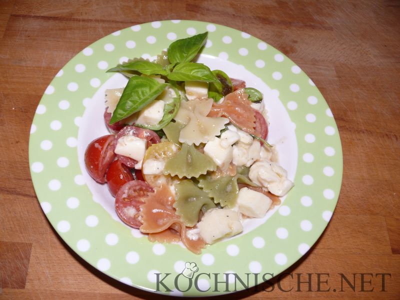 Besonders hübsch wird das ganze, wenn man Pasta Tricolore verwendet – die Farben der Pasta finden sich nämlich eins zu eins in den anderen Zutaten wieder.