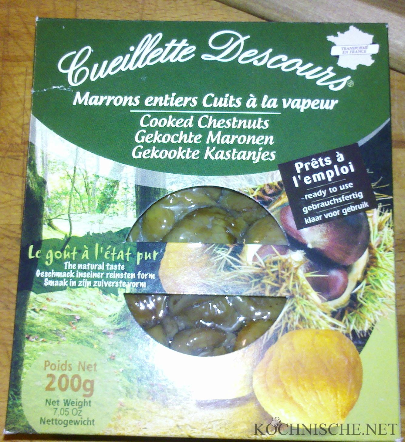 - 200 g Maronen (geschält, vorgegart vakuumiert, aus der Gemüseabteilung gut sortierter Supermärkte)