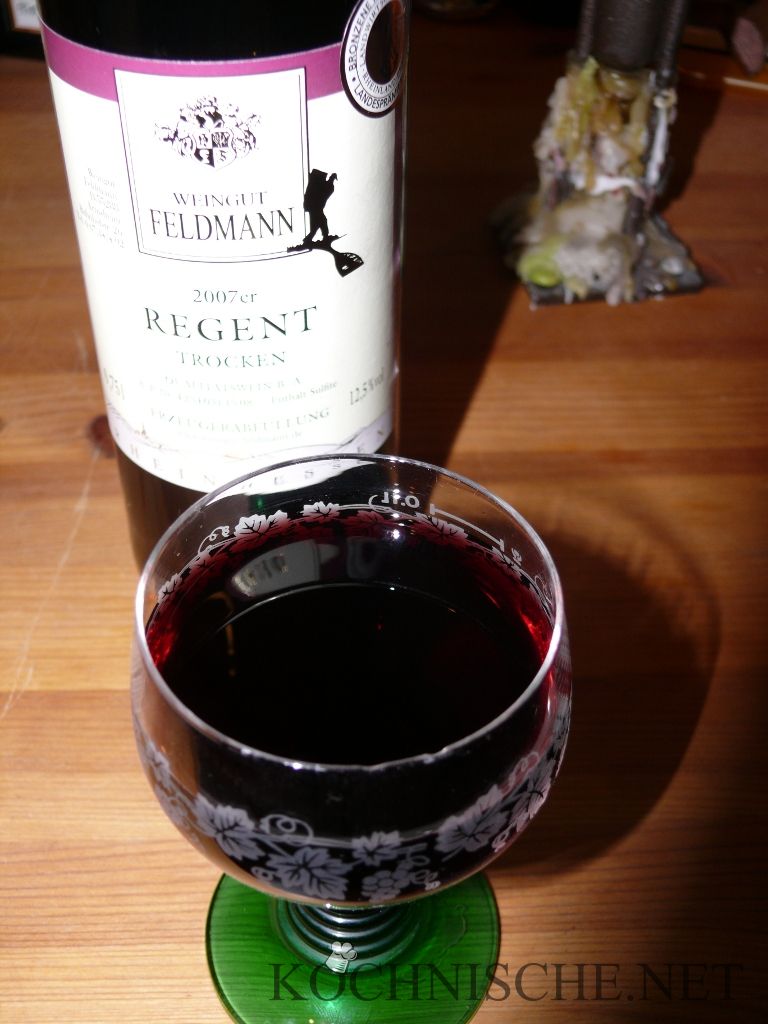 Dazu haben wir einen 2007er Regent trocken aus Rheinhessen getrunken. Dieser sehr dunkle Wein (der ursprünglich nur als Deckwein kultiviert wurde) mit feinen Säure und leicht herbem, langem Abgang harmoniert wunderbar mit der süß-herben Orangensauce und dem feinen Aroma der Ente.