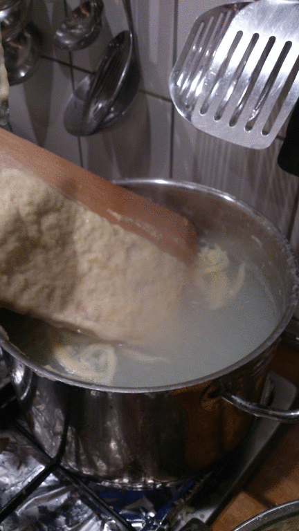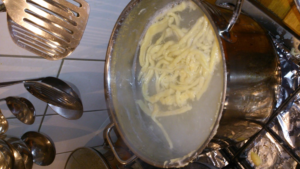 Aus Mehl, Eiern, Salz und Wasser einen zähen Teig rühen. Stilecht: Mit dem Holzlöffel in der großen Schüssel. Der Teig sollte sehr langsam vom Löffel fließen, also streichfähig aber nicht flüssig sein.