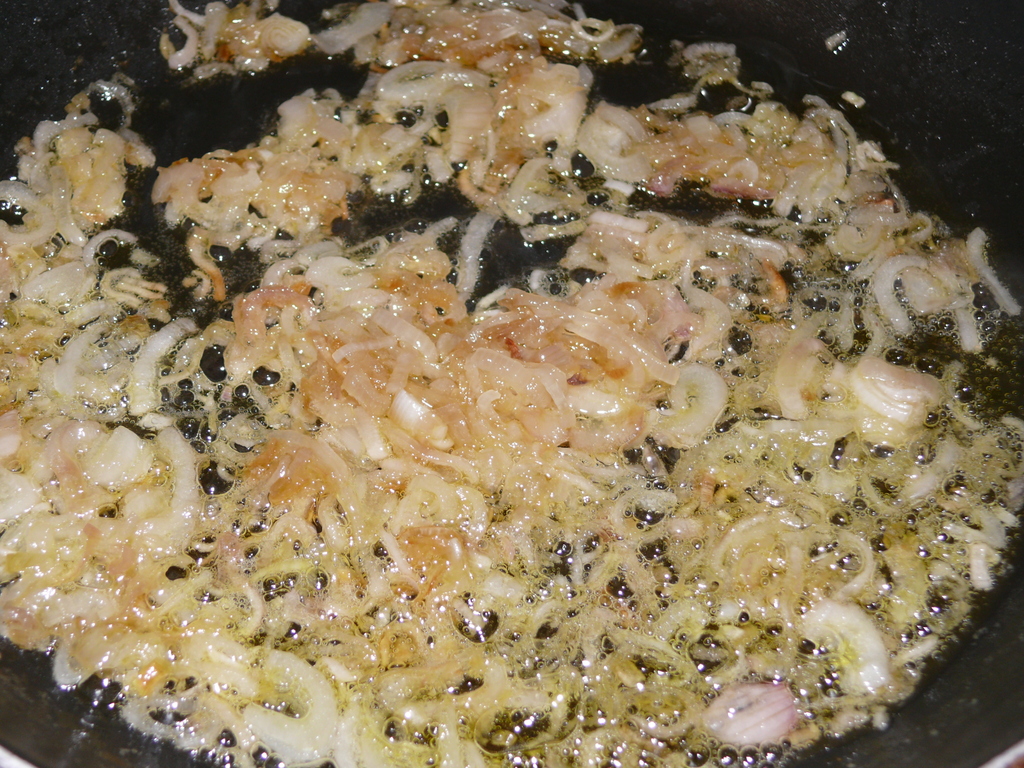 Schalotten in halbe Ringe schneiden und in der Butter bei sehr schwacher Hitze etwa 10 Minuten garen.