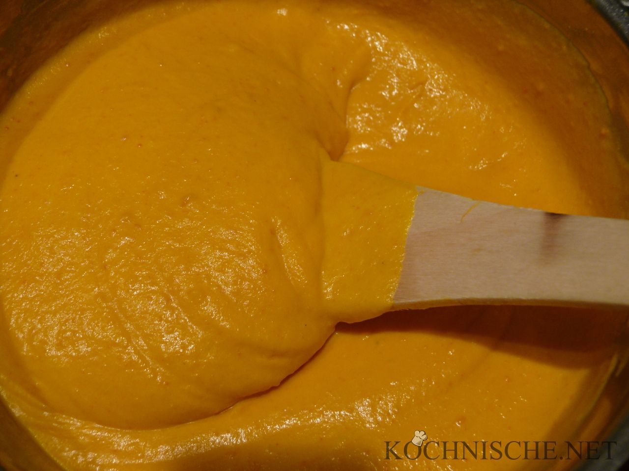 Die Suppe soll dickflüssig sein, bei Bedarf beim Erwärmen nochmals etwas Wasser zugeben.