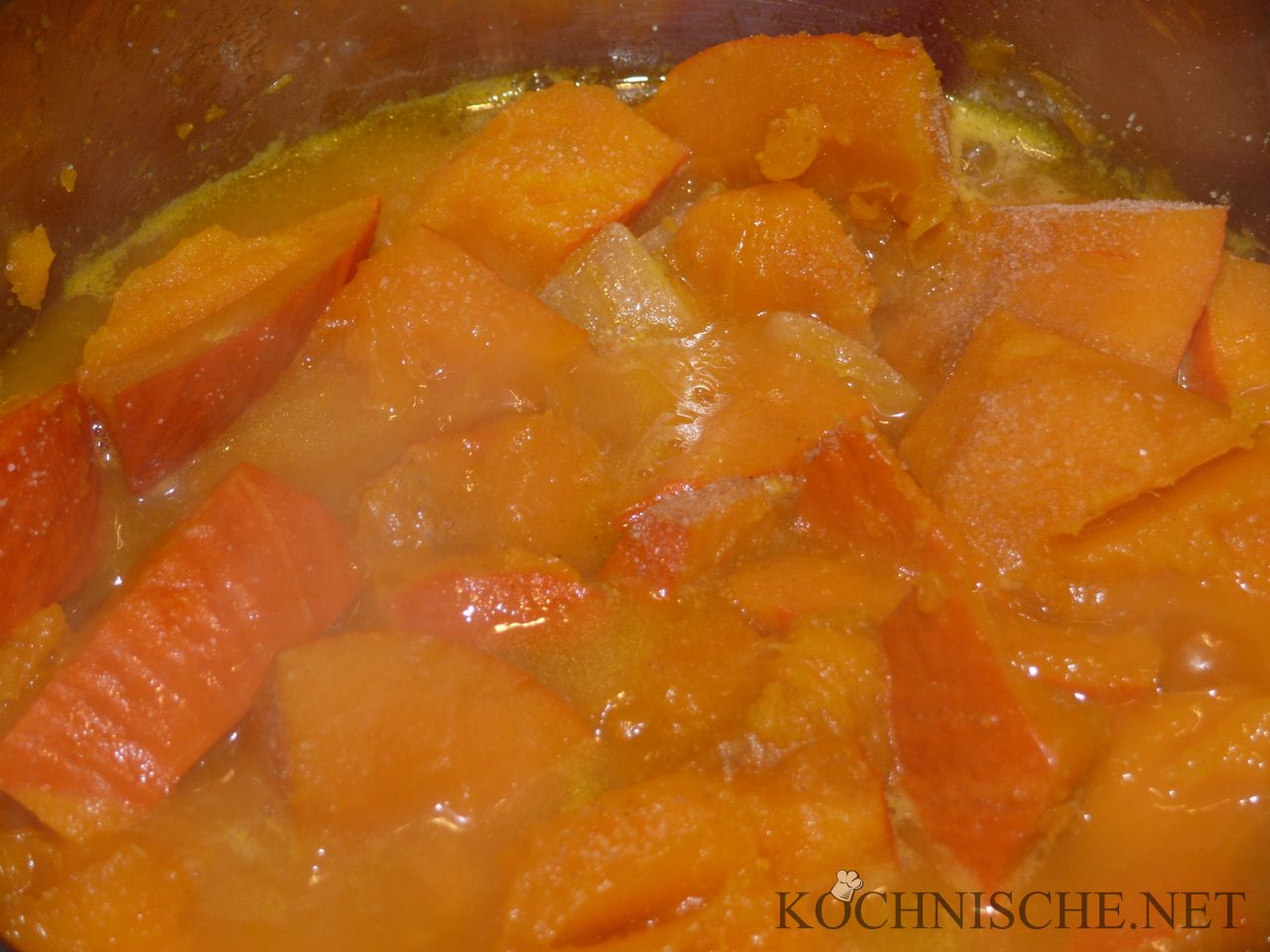 Die Zwiebel im Rapsöl etwas anbraten, Kürbis, Ingwer und Zitronengras zugeben. So viel Wasser angießen, daß der Kürbis fast bedeckt ist (etwa ½ Liter).