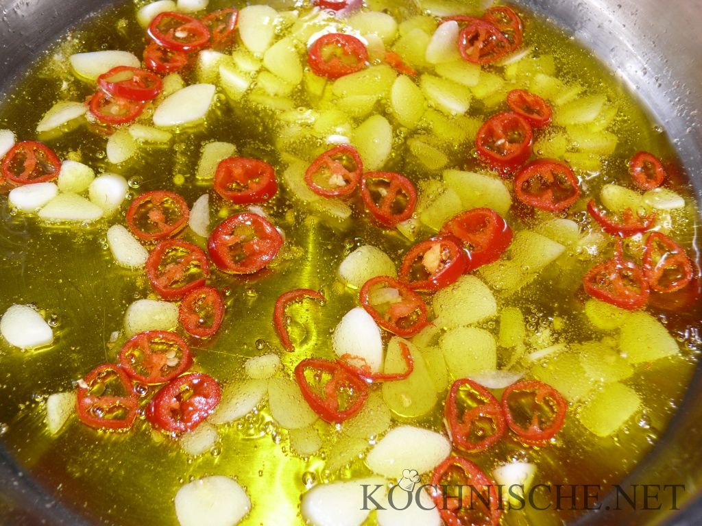 Olivenöl in einer Edelstahpfanne erwärmen (nicht zu stark erhitzen, wir wollen hier nichts “scharf anbraten”!), Knoblauch und Chilli zugeben und darin langsam garen. Der Knoblauch soll nicht braun, sondern nur weich werden.