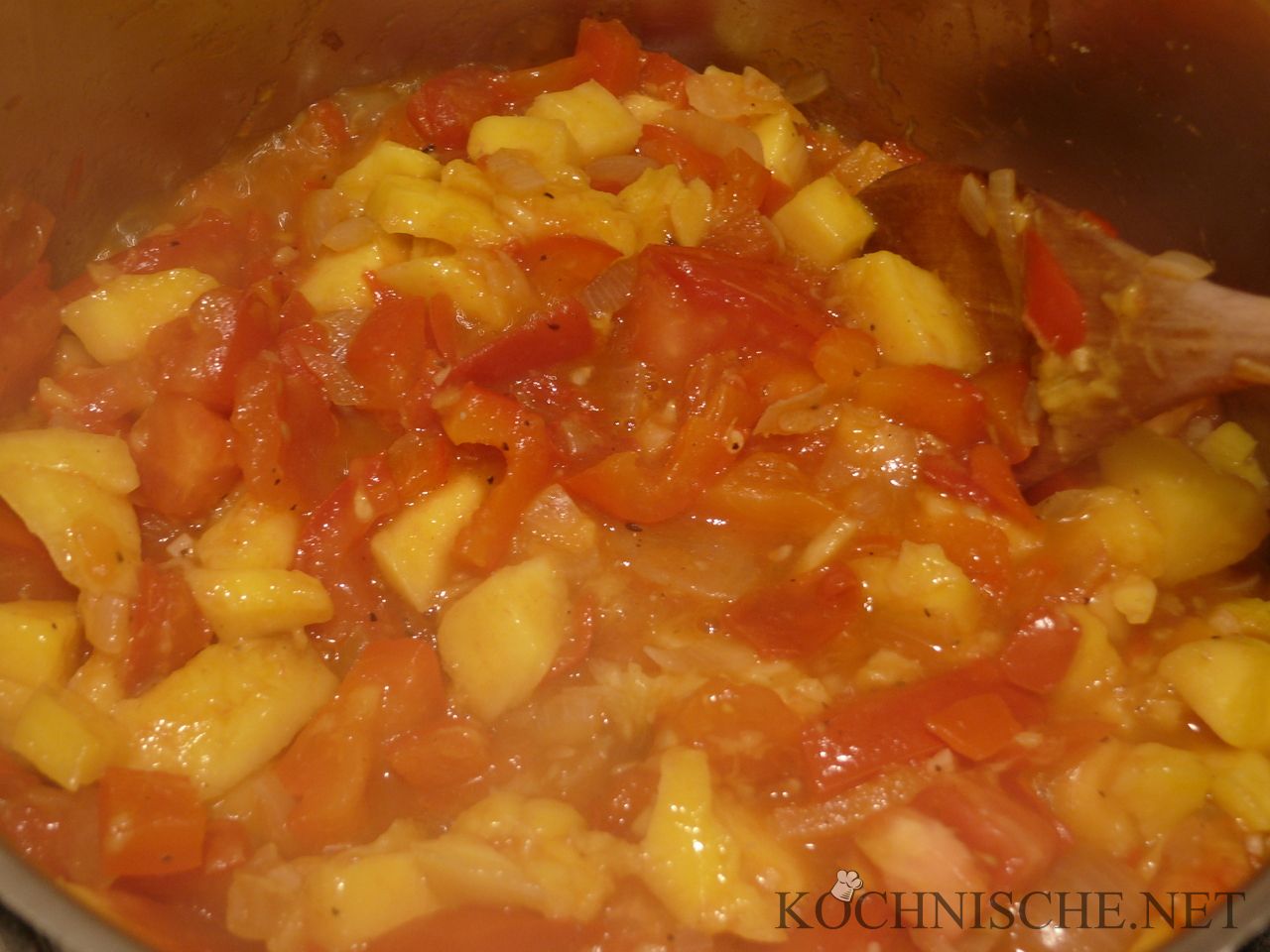 Eine gute halbe Stunde bei schwacher Hitze köcheln lassen, häufig umrühren.