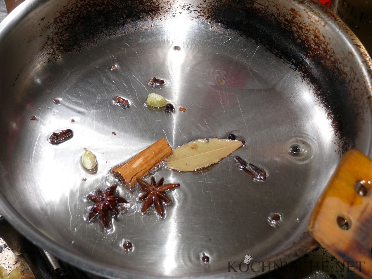 2 Esslöffel Öl in einer unbeschichteten Pfanne erhitzen. Darin Kardamom, Sternanis und Zimt, sowie die Hälfte der Lorbeerblätter, Nelken und Pfefferkörner anbraten. Wenn die Gewürze eine dunkle Farbe haben, Zwiebeln und Ingwer hinzugeben und mit braten.