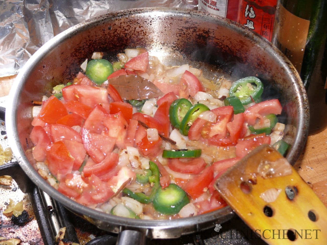 2 Esslöffel Rapsöl in der Pfanne erhitzen. Die restlichen Gewürze darin anbraten, bis sie dunkelbraun sind. Die Jalapeños und die Zwiebeln zugeben und mit braten, bis die Zwiebeln glasig sind. Dann die Tomaten zugeben, die Pfanne schließen und bei kleiner Flamme für einige Minuten simmern lassen.