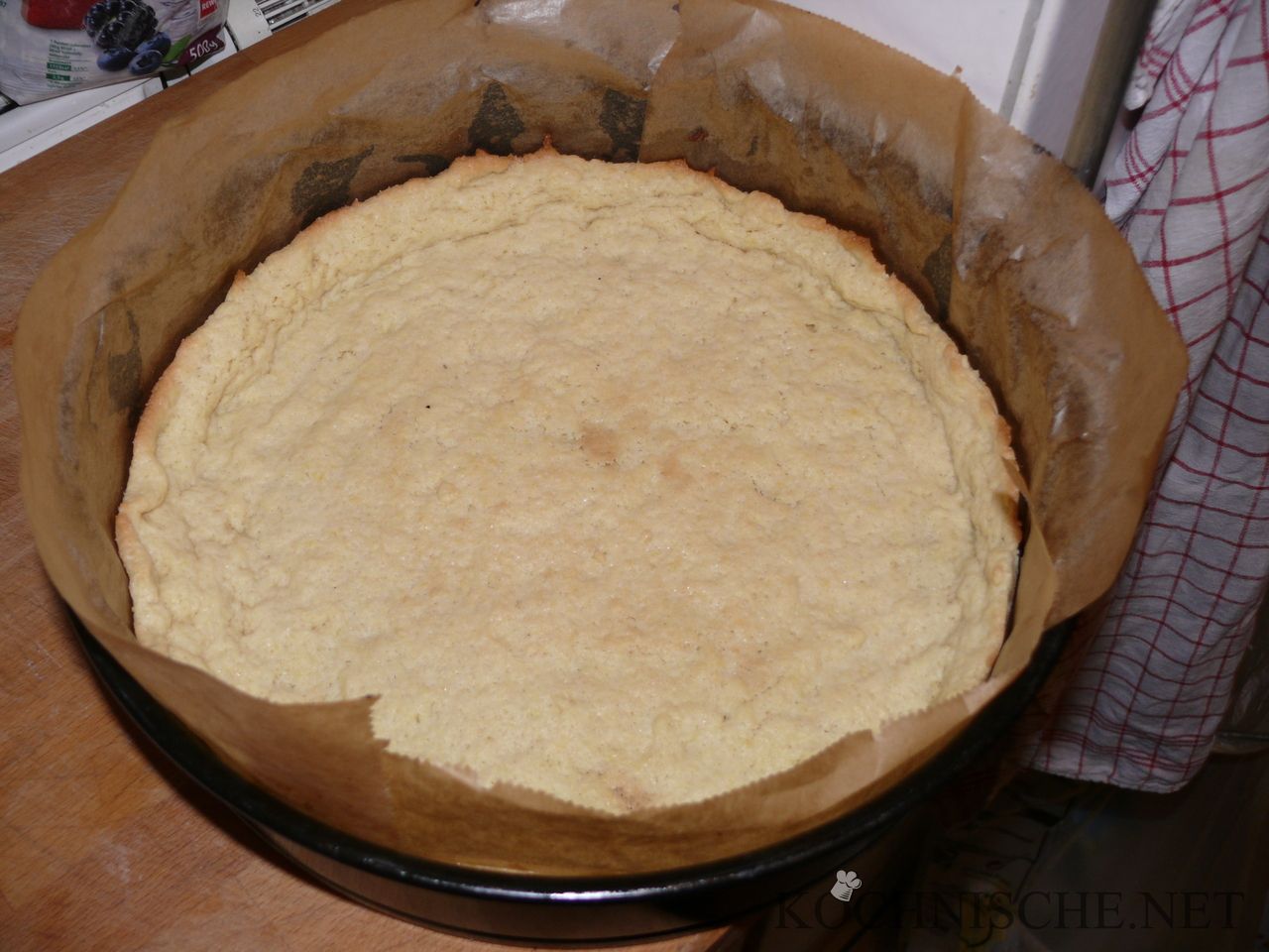 Ausrollen und in eine mit Backpapier ausgelegte Springform (26-28 cm) legen, dabei einen ca. 2 cm hohen Rand bilden. Das geht am besten, indem man ca. ¼ des Teigs zu einer langen Wurst formt und ringsherum in der Springform andrückt.