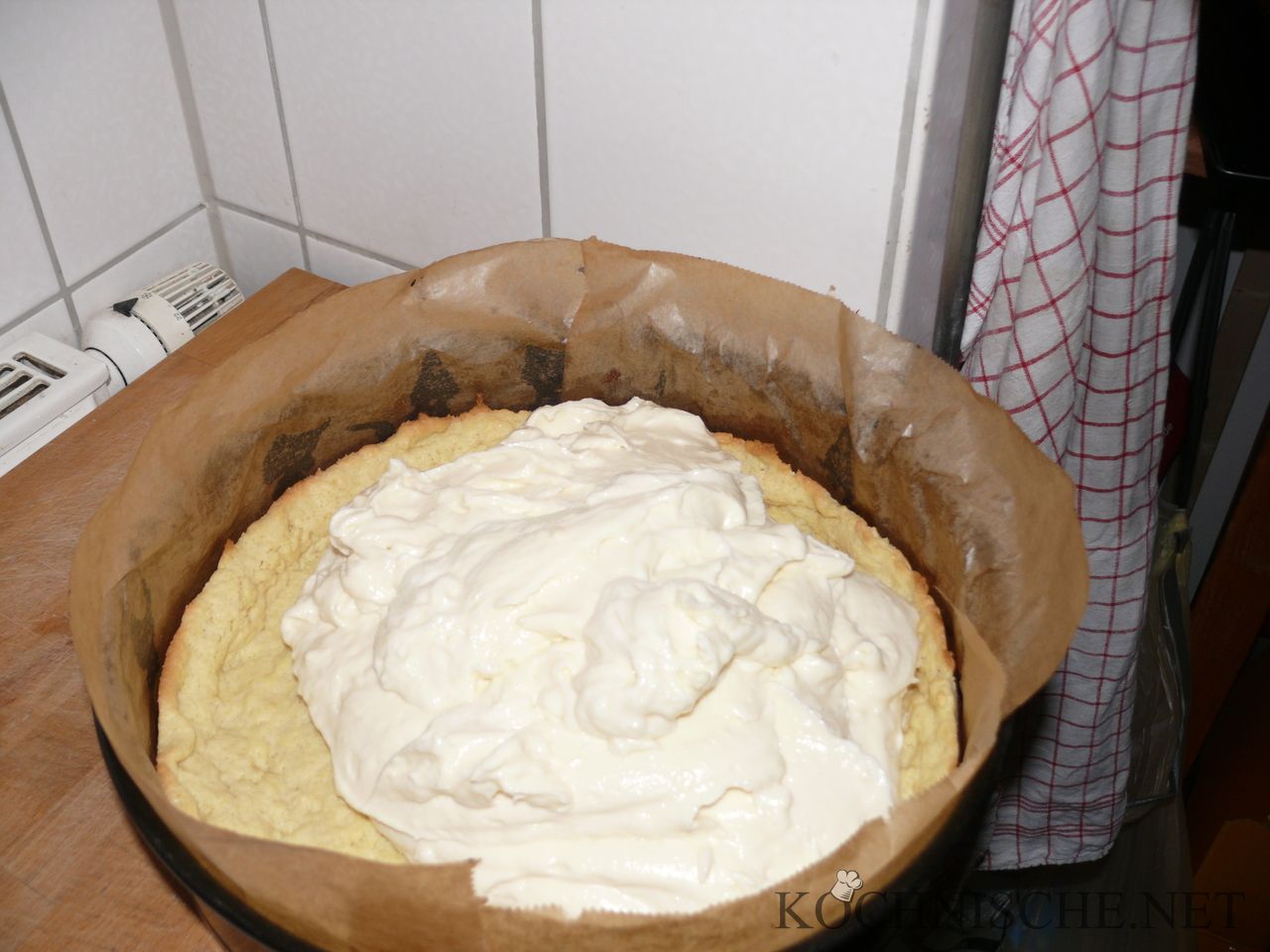 Die Quark-Puddingmasse auf den vorgebackenen Boden geben und glatt streichen.