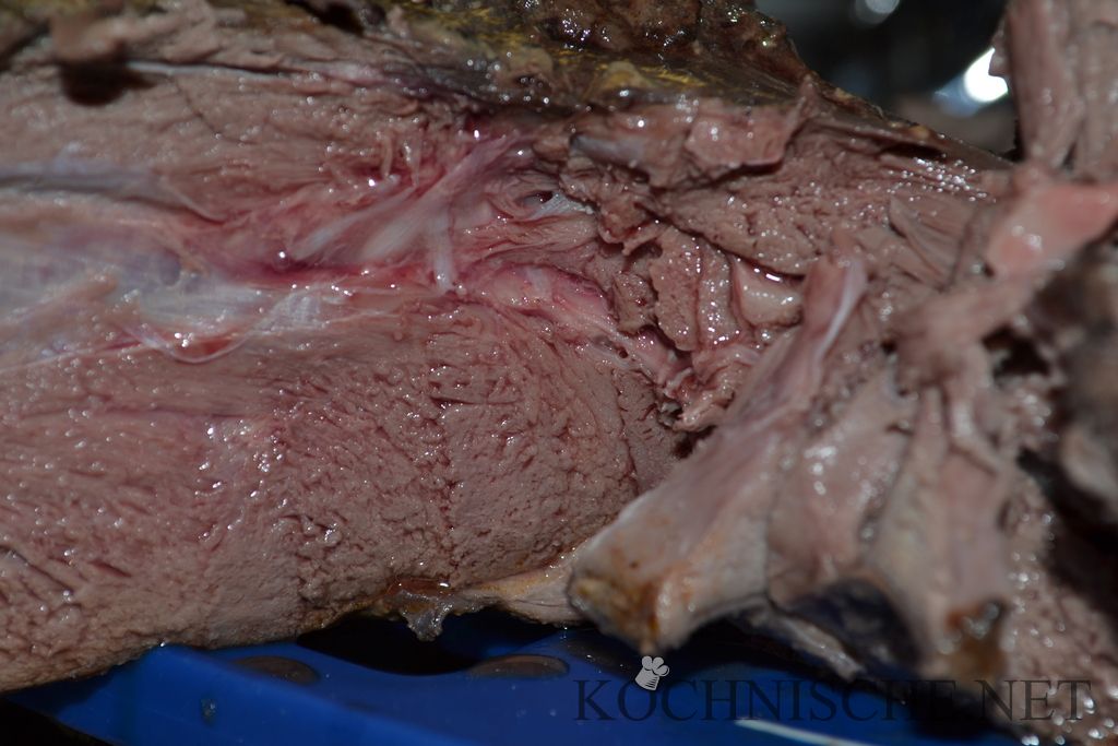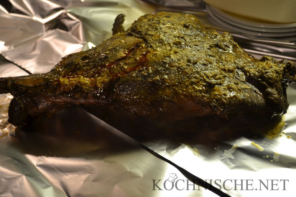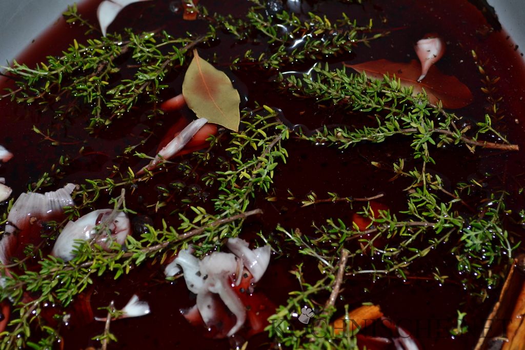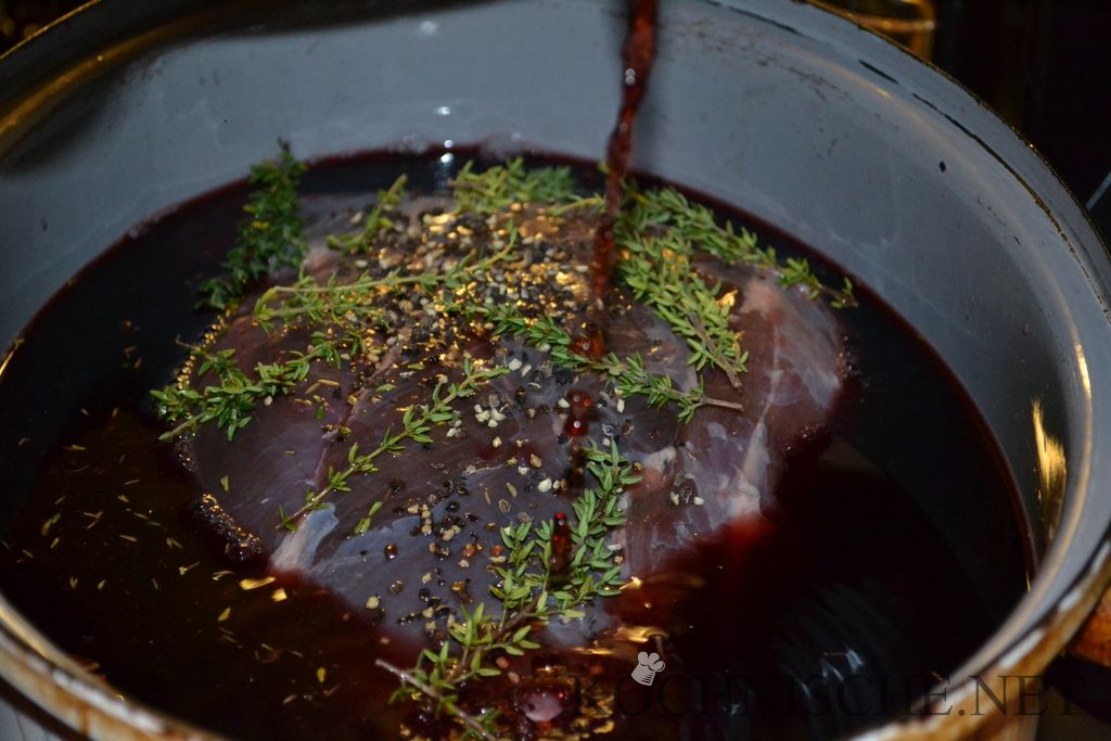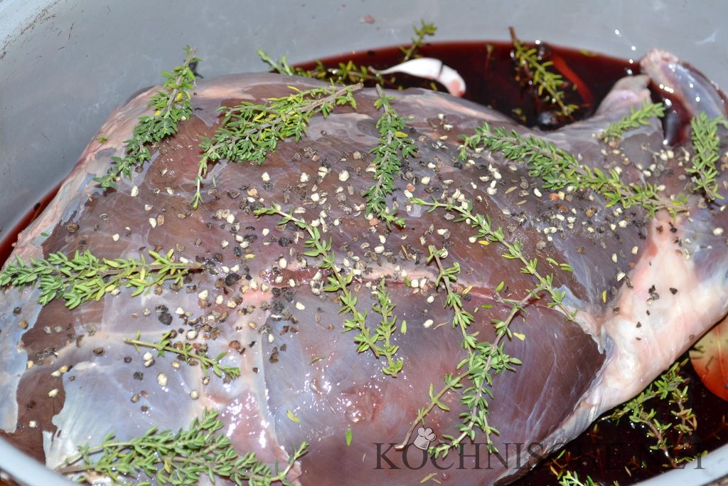 Ich habe hier jeweils eine 2.5 kg bzw. 2.8 kg schwere Keule verwendet – das Reh war also schon 2-3 Jahre alt. Falls ihr die Keule eines einjährigen Rehs (ca. 1-1.5 kg) verwendet, solltet ihr auf das lange Beizen im Rotwein verzichten. Statt dessen das Fleisch zusammen mit den Gewürzen luftdicht verpacken (Zip-Lock-Beutel / Vakuum / …) und ziehen lassen. Dann später Wein statt der Marinade angießen.