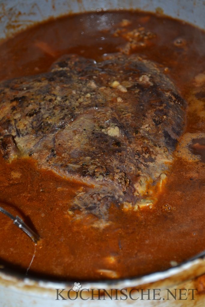 Das Fleisch bei (je nach gewünschtem Gargrad) 60°C (innen medium-rare) bis 70°C (well-done) Kerntemperatur aus dem Bräter nehmen (auf den Photos: 68°C), abtropfen und fest in Alufolie einwickeln. Im ausgeschalteten Backofen ruhen lassen. Die Bratensauce pürieren, falls nötig reduzieren. Wer sie fein mag: Durch ein Sieb streichen. Creme Fraich einrühren. Sahne zugießen. Mit Salz & Pfeffer abschmecken. Die kalte Butter einrühren. Falls die Sauce noch zu flüssig ist, Speisestärke mit etwas kaltem Wasser anrühren (am besten im Schüttelbecher) und in die heiße Sauce einrühren, bis die gewünschte Konsistenz entsteht. Sehr fein gehackte Petersilie 2-3 Minuten vor dem servieren zugeben.