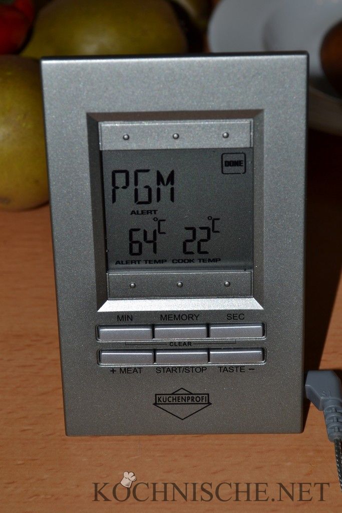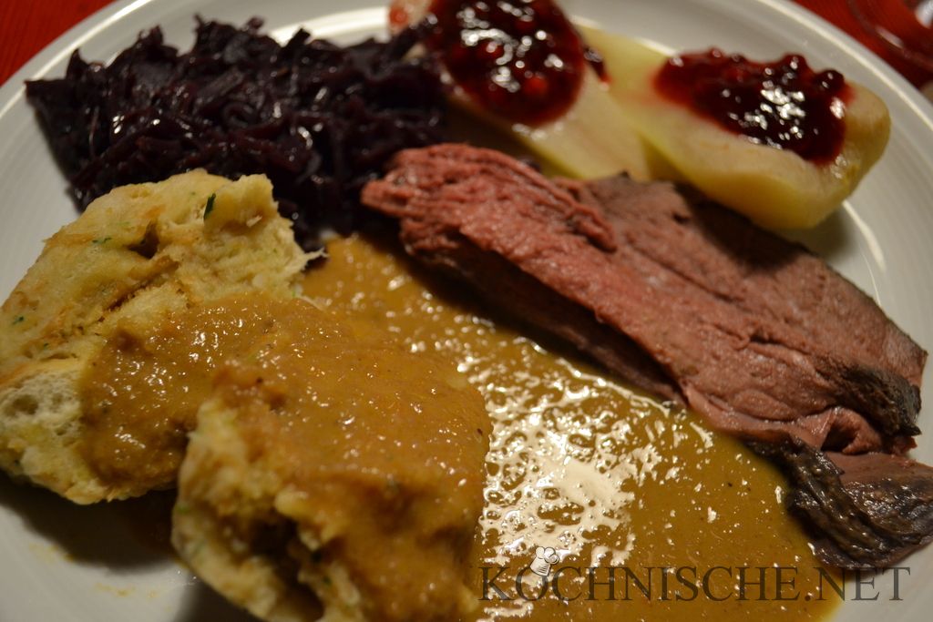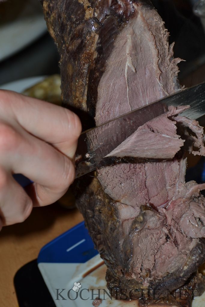 Ein Rezept für eine Rehkeule zu finden ist deutlich schwerer als ich vermutet hatte. Selbst der Kochbuchladen des Vertrauens – und der hat wirklich viele Kochbücher – konnte da nicht ganz weiterhelfen. Schließlich habe ich dieses Rezept hier als Kreuzung aus einem schönen Rezept für Rehrücken mit Birnen und geschmorter Hirschkeule kreiert. Nachdem im ersten Durchgang das Fleisch doch noch etwa zu rosa war, war es nun kurz hinter dem perfekten Garpunkt – Ich komme also zu dem Schluss, daß mensch irgendwo zwischen 60°C und 68°C Kerntemperatur glücklich werden wird. Letztlich ist das aber natürlich auch noch Geschmackssache. Unterm Strich waren alle Beteiligten sehr zufrieden und ich kann diesen Gang nun endlich guten Gewissens veröffentlichen.