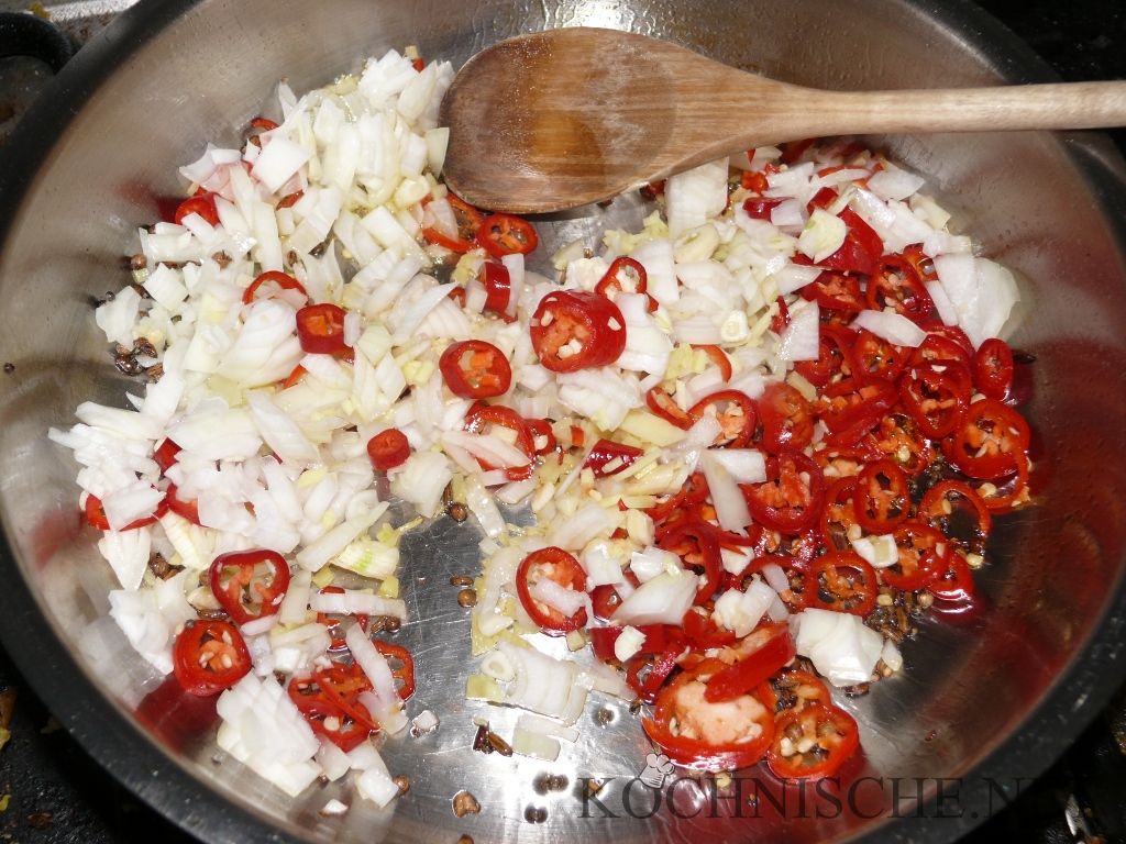 Ingwer, Knoblauch und Zwiebeln fein Würfeln, Chilli in Scheiben schneiden.