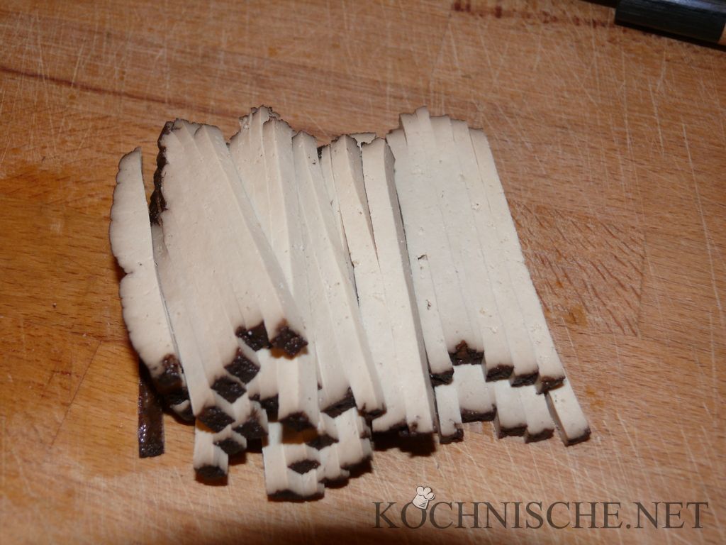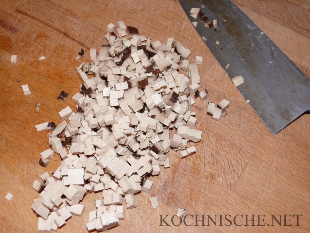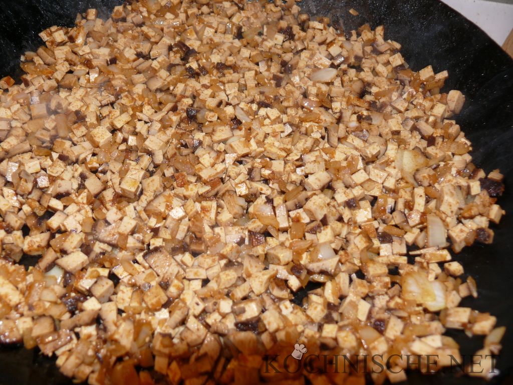 Den Tofu auspacken, abtrocknen und würfeln. Wichtig für ein gutes Ergebnis ist, daß die Tofuwürfel wirklich fein werden. Eine Kantenlänge von 2-3 mm hat sich bewährt. In diesem Sinne, zuerst den Tofu in 2-3 mm dicke Scheiben, dann Stifte, dann Würfel schneiden. Die Zwiebel ebenfalls fein würfeln.