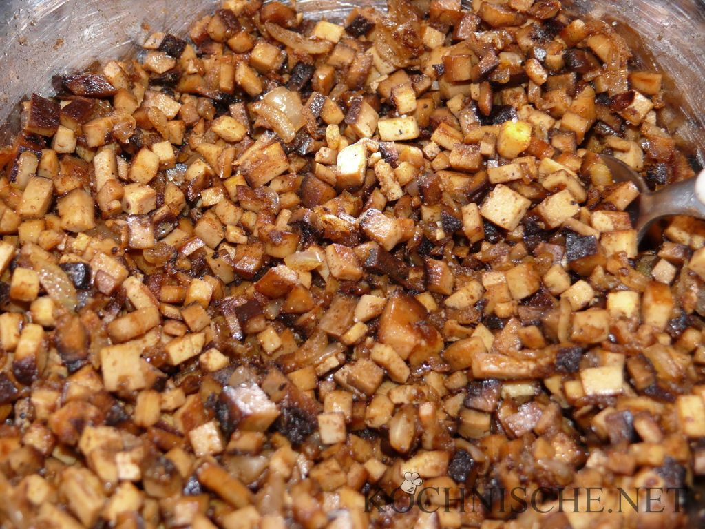 Eine Schmiede- oder Gusseisenpfanne mit etwas Raps- oder Sonnenblumenöl stark erhitzen. Den “Speck” in 2-3 Portionen gründlich unter gelegentlichem Rühren bei starker Hitze anbraten. Das dauert, je nach möglicher Hitze, etwa 5-10 Minuten pro Portion. In einer Schüssel abkühlen und 1-2 Stunden ruhen lassen. Fertig ist der “Fake-Speck”. Pur ist er schon sehr lecker und richtigen Speckwürfeln durchaus ähnlich. In diversen Gerichten weiter verarbeitet merkt kaum jemand, daß es sich um ein veganes Substitut handelt. Der Speck hält sich im Kühlschrank einige Tage, lässt sich also auch gut “auf Vorrat” herstellen.
