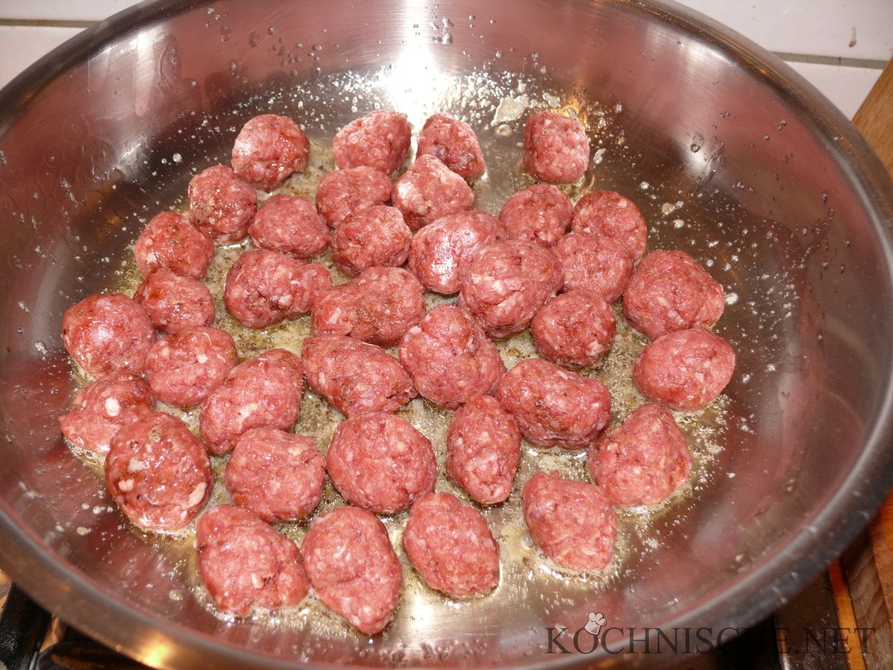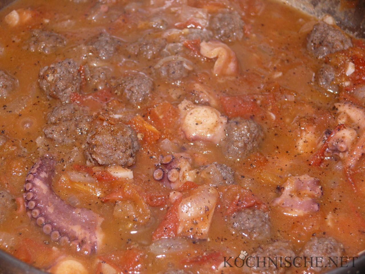 Den Oktopus gründlich abtropfen. Das Rindfleisch mit Paprikapulver, Salz und Pfeffer kräftig würzen und zu etwa haselnussgroßen Fleischbällchen formen.