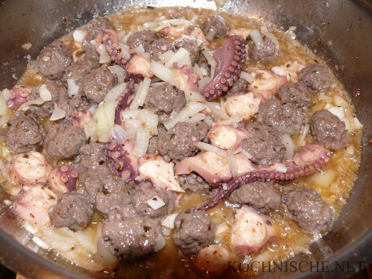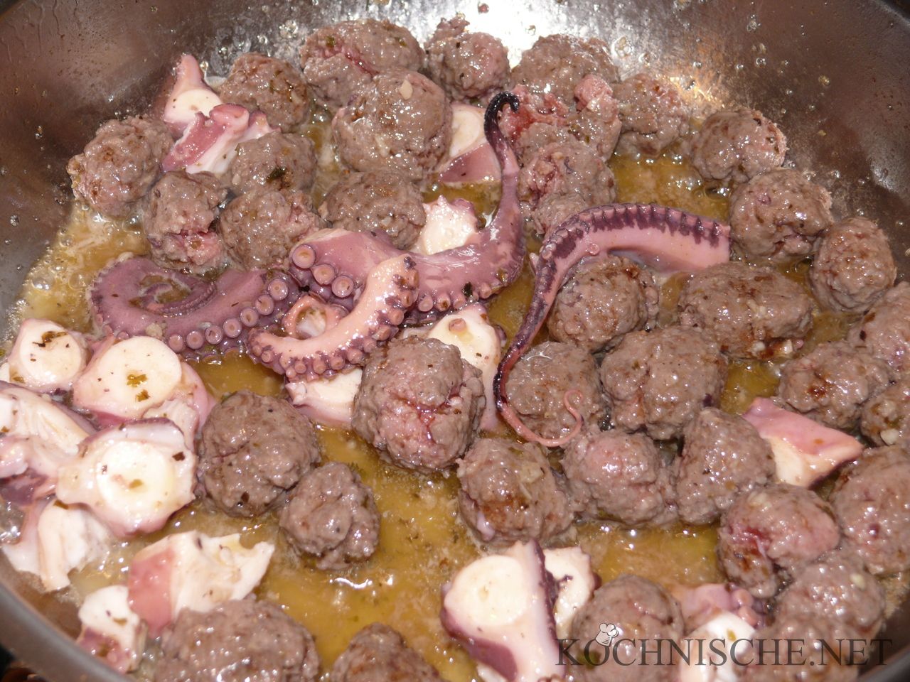 Die Kräuterbutter und das Olivenöl in einer Edelstahlpfanne leicht erhitzen. Die Hackbällchen darin rundherum leicht anbraten, dann den Oktopus, nach ein bis zwei Minuten auch die Zwiebeln und den Knoblauch zugeben und für weitere zwei Minuten mit braten.